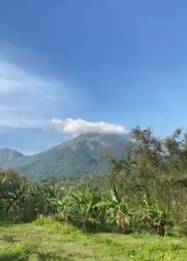 mountain covered in lush greenery, topped by a fluffy white cloud, set against a clear blue sky. In the foreground, there's a field of green grass, dotted with banana trees and other leafy vegetation. A motorcycle can be seen parked at the edge of the field. A person wearing a black helmet briefly appears in front of the camera.