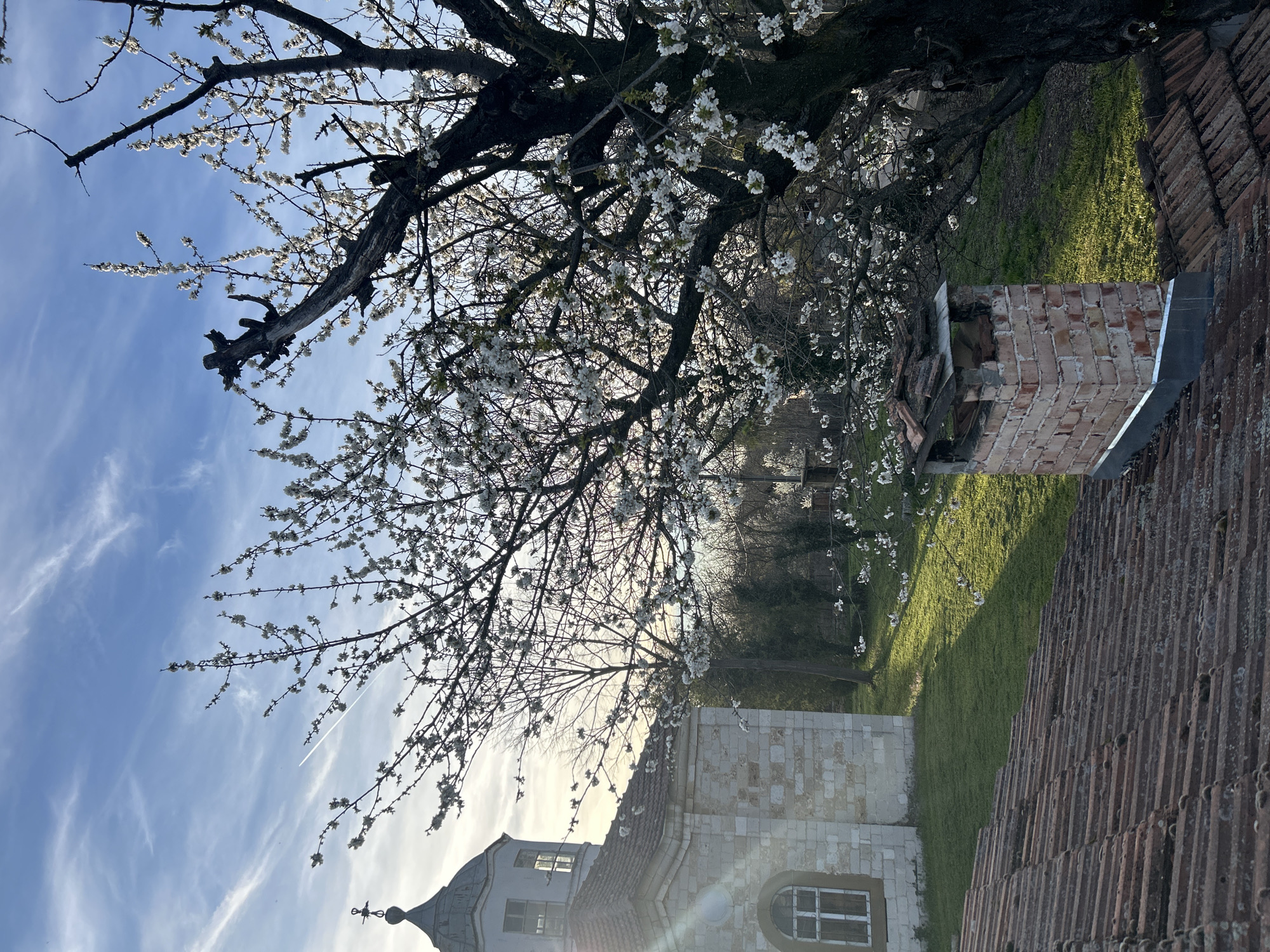 The image captures a scene in Krushuna, Bulgaria, featuring a building with a light-colored stone facade and a gray dome-shaped roof visible against a partly cloudy blue sky. A large blossoming tree dominates the view, its branches filled with white flowers. In the background, there's green grass and a line of trees. A brick structure, possibly a chimney, sits on a section of roof tiled with red clay tiles. A bright light source, likely the sun, is positioned behind the building, creating lens flare.