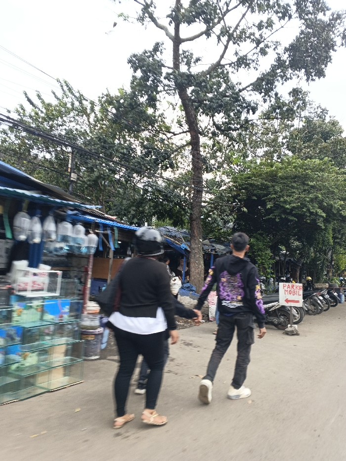 A woman wearing a helmet, black sweater, white undershirt, and black leggings walks hand-in-hand with a man in a hooded jacket with purple designs and dark pants. They walk on a paved road with trees in the background, alongside a makeshift market selling items like water bottles and aquarium tanks. Motorcycles are parked near a sign that reads "Parkir Mobil" with an arrow, suggesting parking for cars is available.