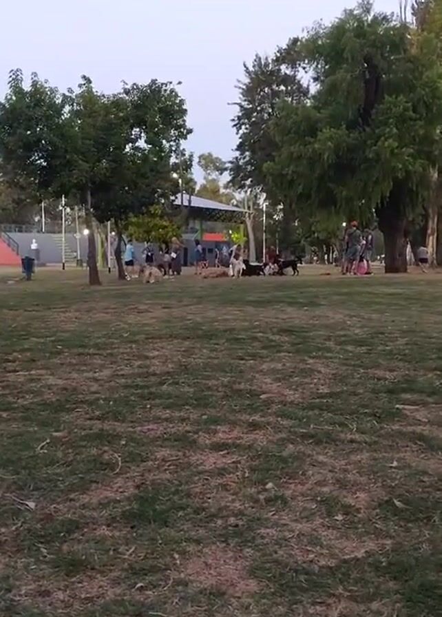 grassy park area with people and dogs gathered in the distance. Several trees of varying sizes are scattered around. The sky is pale and overcast. There's a structure with a covered area in the center background, and bleacher seating visible to the left. People are standing and walking, some appear to be interacting with the dogs. The dogs are various breeds and sizes, some are moving around, others are lying down. A large piece of wood is in the lower foreground, slightly obstructing the view. The camera remains mostly still.