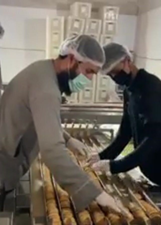 In a brightly lit industrial setting, three men wearing hairnets and face masks are engaged in the manual handling of cylindrical items
