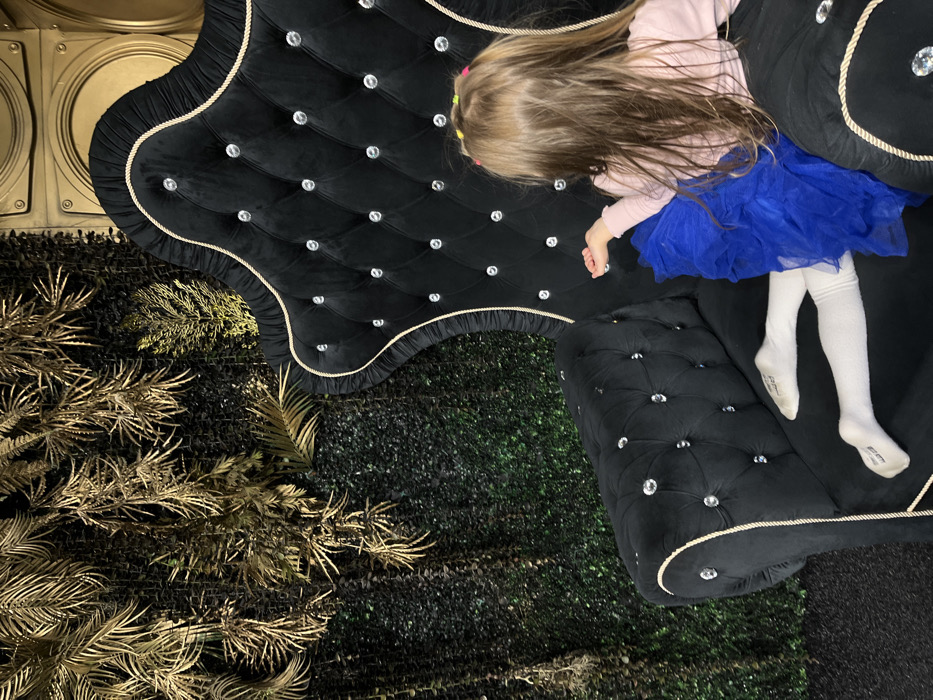 A young girl lies on a black, tufted couch with crystal accents