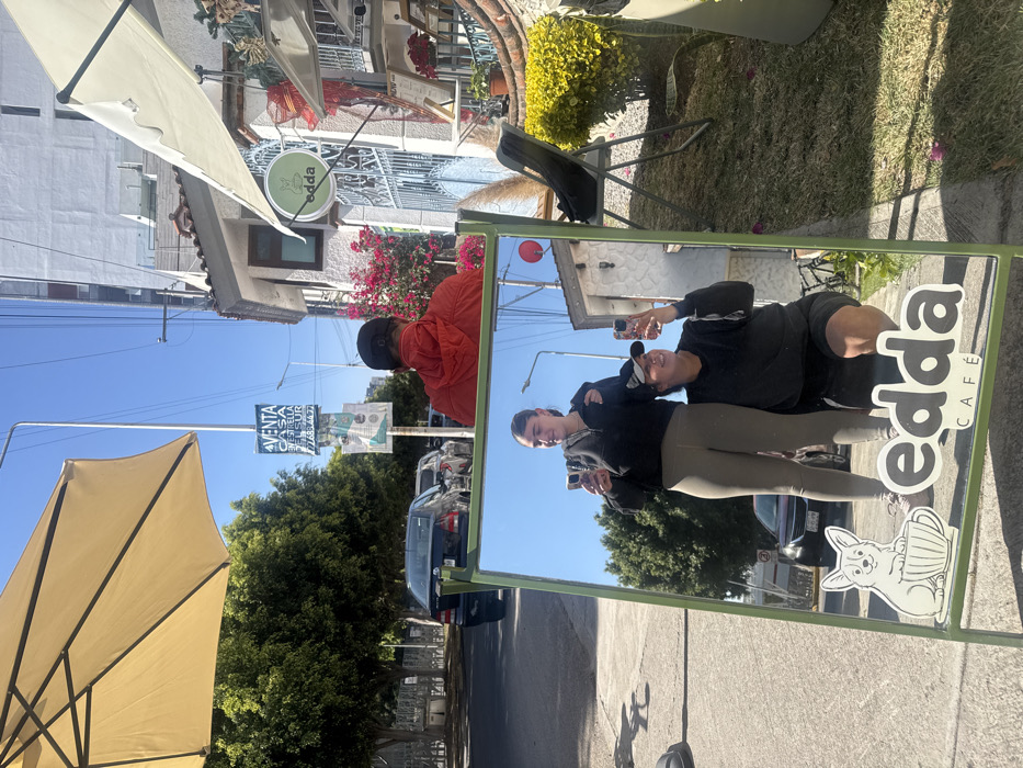 A reflective street sign reads "edda CAFÉ" with a dog illustration