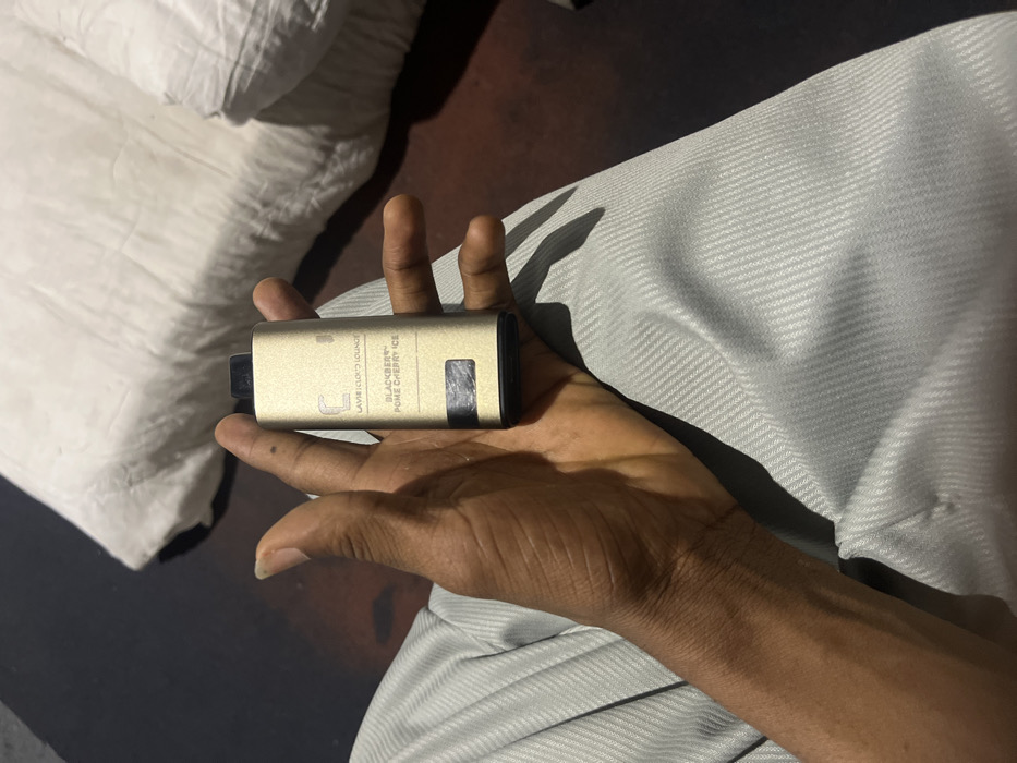 A dark-skinned hand holds a golden vape pen