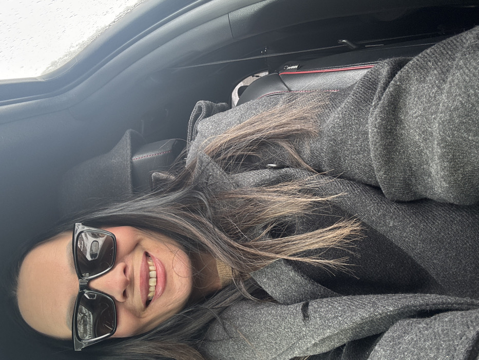 An adult individual is seated within a vehicle in Chaikovsky, Russia. The individual has long dark hair and is wearing black rectangular sunglasses. A smile is present on the individual's face, revealing visible upper teeth. They are dressed in a dark gray wool overcoat, with a lighter, possibly beige, garment visible underneath. The vehicle's interior features dark upholstery, exhibiting red stitching on the seat headrest and side bolster. A black seatbelt is visible to the right. Through the vehicle's window, a blurred, bright exterior environment is discernible, with precipitation streaks evident on the glass. Reflections of external structures are visible in the sunglasses.