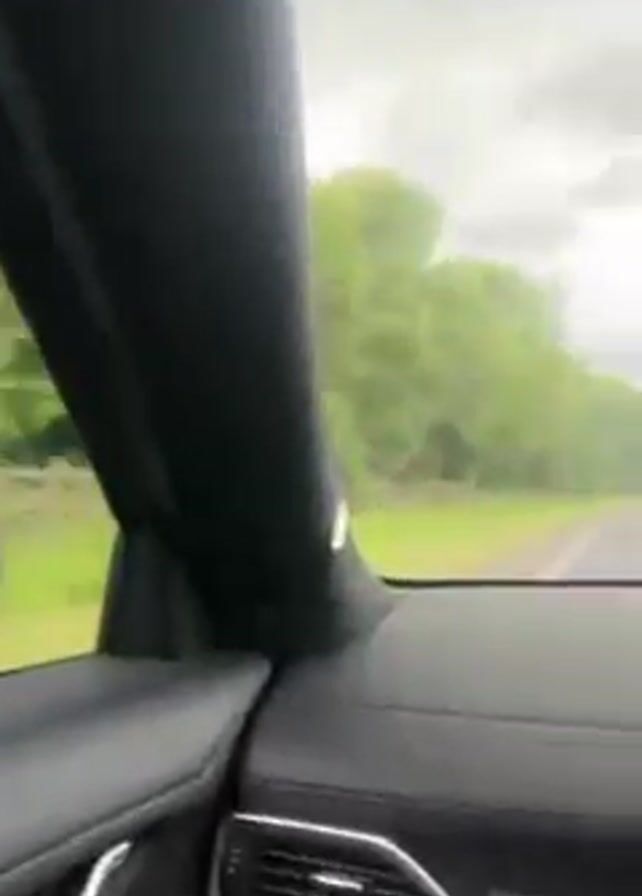 view from inside a car moving along a paved road. The environment consists of green trees and fields visible outside the windows, with a cloudy sky overhead. The car's dashboard and side mirror are visible in the foreground. The road appears to be a country road with a light amount of traffic.
