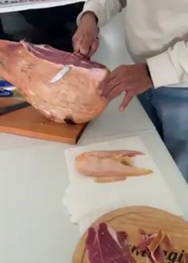 - "A man in a white sweater and blue jeans is slicing a cured ham on a wooden cutting board" by FM-avfjN2, licensed under CC BY 4.0
