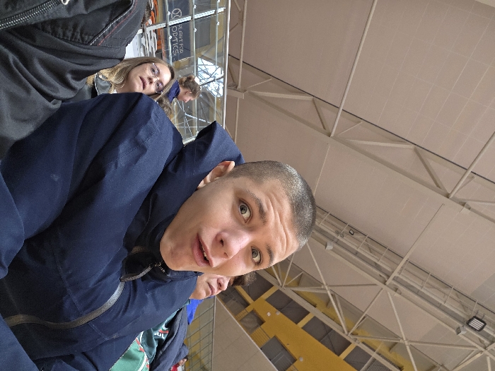 The image depicts the interior of a sports hall, specifically the "Arena Asarel" in Panagyurishte, Bulgaria. The foreground is dominated by a young male with a buzz cut and blue eyes, looking directly at the camera with a wide-eyed, slightly surprised expression and an open mouth. He wears a dark navy blue padded jacket with the zipper partially undone. To his immediate left and slightly behind him, a woman with long brown hair and eyeglasses looks upwards and to the right. Behind the primary subject, another individual's head and shoulder are visible, dressed in a green and white garment. The background features tiered spectator seating occupied by blurred figures. Above, the ceiling exhibits white exposed metal trusses and beams, along with white panels and several dark industrial light fixtures. A bright yellow wall section is visible in the upper right. A partially visible white banner or sign in the middle background reads "PLANT FOR OPTICS".