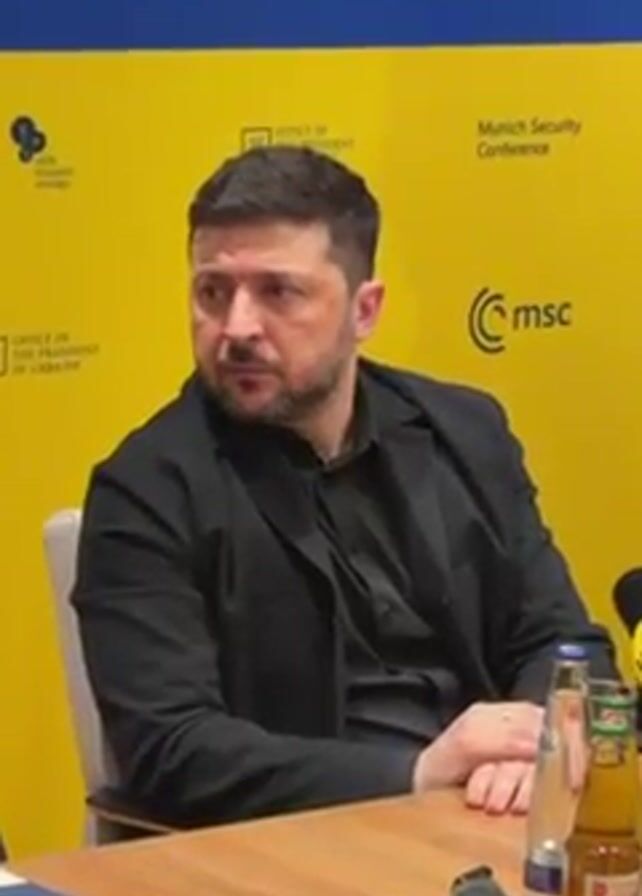 In a medium shot, President Zelensky of Ukraine sits at a wooden conference table. He is wearing a black suit jacket and shirt. He sits in front of a yellow and blue backdrop, featuring branding for the Office of the President of Ukraine and the Munich Security Conference. Several microphones, a bottle of water, and a bottle of what appears to be apple juice, sit on the table in front of him. He listens intently to someone off-camera as they ask him a question.
