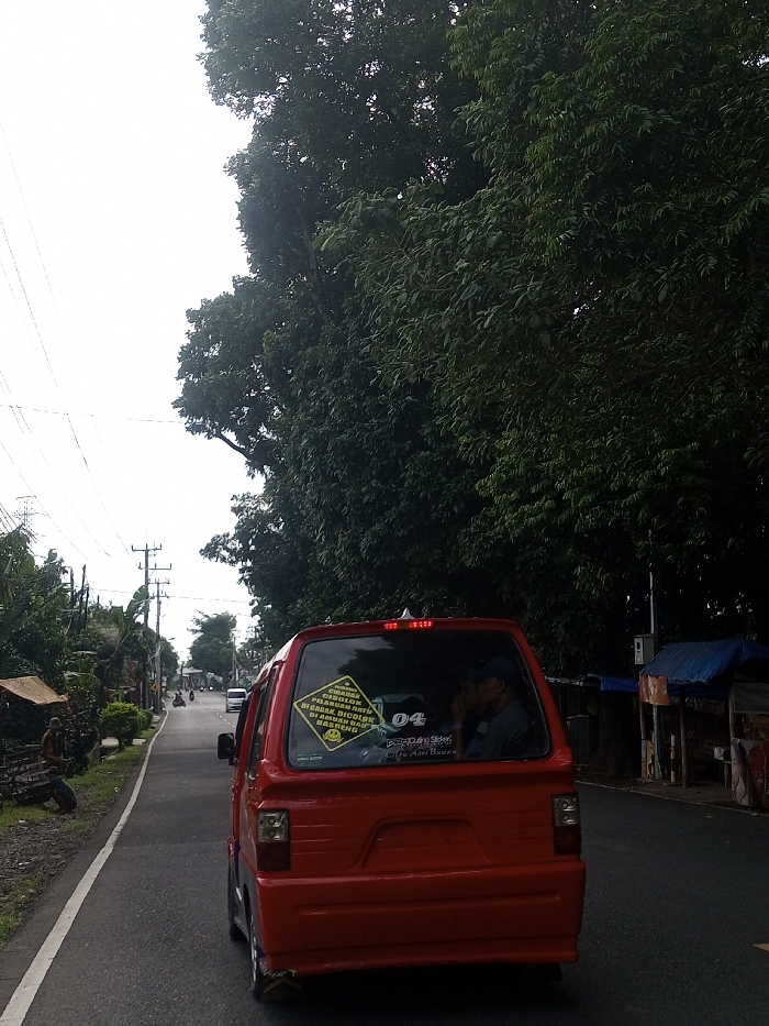A red van is seen from behind on a road lined with trees. A person is visible in the back of the van. A yellow sticker on the rear window reads, "CIBADAR CISOLOK PLARUAM RATH BIGABAK, BICOLOR BIAMUAN BAU BASRENG" along with a smiley face. A smaller sticker below it says "04" and "Pitru Star, Citra Aari Buan". Overhead wires stretch across the sky. Buildings and greenery line the road in the distance.