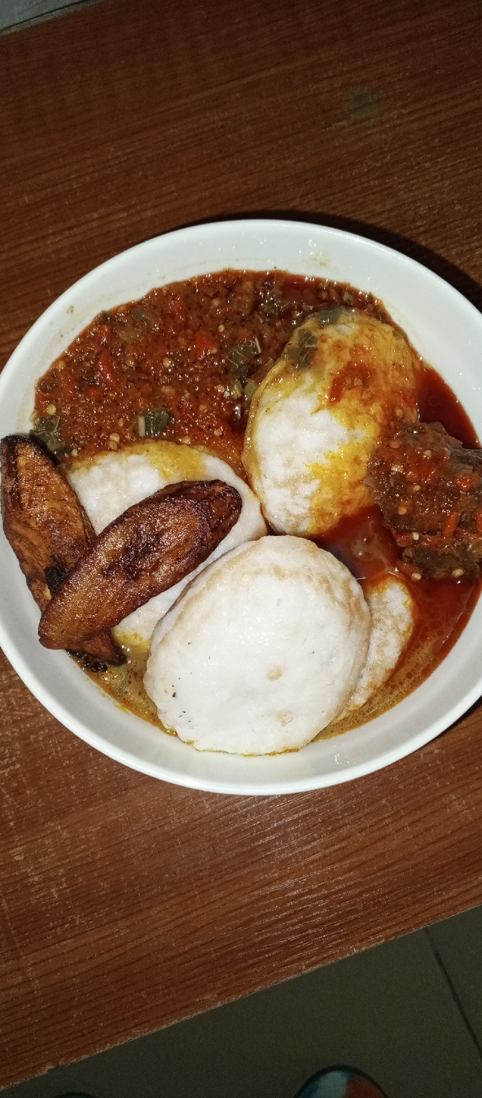 A white, shallow ceramic bowl containing a meal is positioned centrally on a medium-brown wooden surface, viewed from above. The bowl holds three white, irregularly shaped, dough-like food items, partially immersed in a thick, reddish-orange stew. The stew contains visible green fragments, small red particles, and at least one dark, irregularly shaped mass, consistent with cooked meat, on the right side. To the left within the bowl, two elongated, dark reddish-brown food items, appearing fried or roasted, are present. The wooden surface displays a prominent linear grain pattern. A dark, indeterminate surface is visible along the bottom edge, with a small section of a blue, orange, and red object, consistent with footwear, visible in the lower right corner. The location is Narayi, Nigeria.
