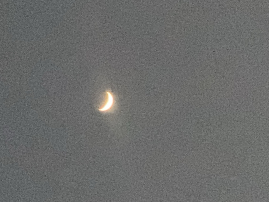 A crescent moon, brightly lit along its curve, floats in a gray, grainy sky