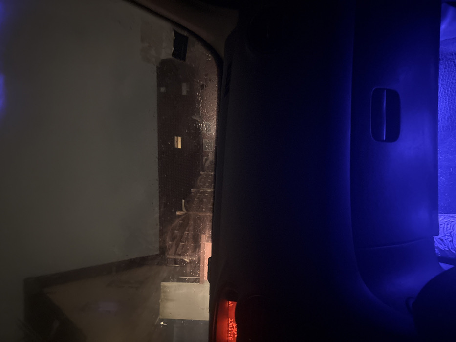 A dimly lit interior view through a car window reveals a scene outside
