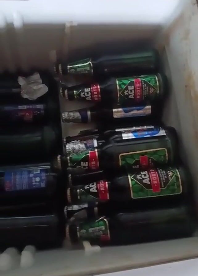 The camera looks into a white, cooler filled with an assortment of bottled drinks. Primarily, the viewer sees "Ace Roots" bottles stacked on top of each other. There are other brands mixed in as well, including “Trophy” and an unidentifiable label on the left side of the frame. The bottles are dark glass. The cooler is old and slightly dirty. A wad of white paper is also in the cooler.