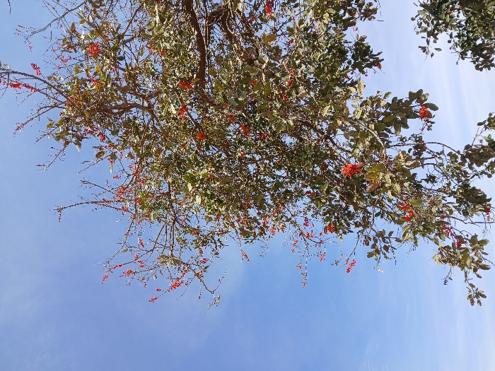 The image presents a detailed view of a tree canopy against a clear blue sky, located in Unguwar Saya, Nigeria. The tree features an abundance of dark green leaves and numerous clusters of bright red, elongated flowers or possibly small fruits. Brown, woody branches are visible, some bare, others covered in foliage and red blossoms. The sky, occupying the upper-left quadrant and parts of the right, is a consistent light blue with minimal, wispy cloud formations. The scene is devoid of human figures, animals, or artificial structures, depicting only natural elements under bright daylight conditions.