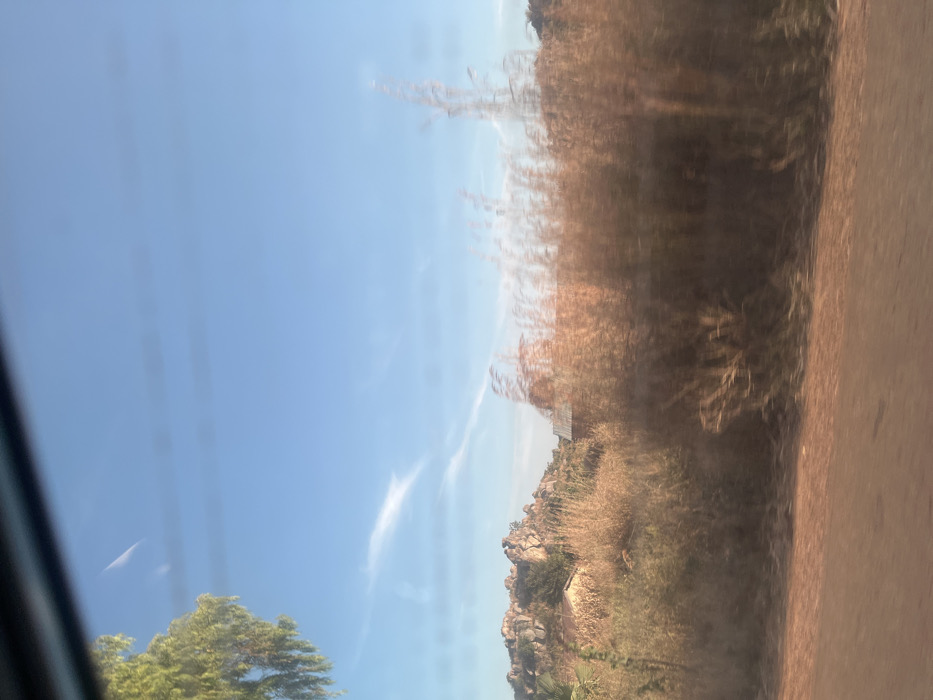 The image captures an outdoor scene in Dorowa, Nigeria, viewed from a moving perspective, evidenced by the motion blur in the foreground and midground. The upper half of the frame displays a clear, pale blue sky with several wispy white clouds or contrails. A dark, diagonal line, indicative of a vehicle's interior component, is visible across the top-left corner. In the midground, prominent, weathered rock formations constitute hills on the left side, interspersed with sparse green vegetation. Below these formations, two structures are discernible: a light-colored building with a dark roof is partially obscured by dry, brownish-yellow vegetation, and to its right, a darker building, possibly with a metallic roof, is also partially obscured and blurred. The ground in this section is heavily covered by dense, tall, dry, brownish-yellow grasses and bushes, exhibiting significant motion blur. The foreground, occupying the bottom quarter of the image, consists of a reddish-brown dirt road or path. No individuals or active interactions are visible. The scene depicts a rural or semi-arid environment characterized by rocky terrain and dry season vegetation.