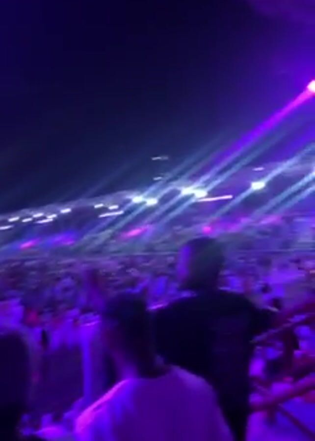 large crowd gathered at an outdoor event at night. The crowd is viewed from a higher vantage point, possibly from a seating area or platform. The scene is illuminated with bright purple and white lights, creating a vibrant atmosphere. Many people are standing and moving, and their faces are not clearly visible due to the distance and lighting. In the foreground, a few individuals are visible, including one wearing a white shirt and a hat. The background features a large open area filled with people, along with some tents or structures. The video appears to be taken during a live performance or concert, with the crowd enjoying the show.