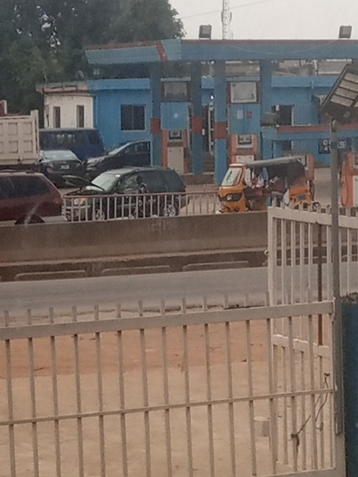The scene depicts a street view in Ijaiye, Nigeria, focused on a gas station and adjacent roadway