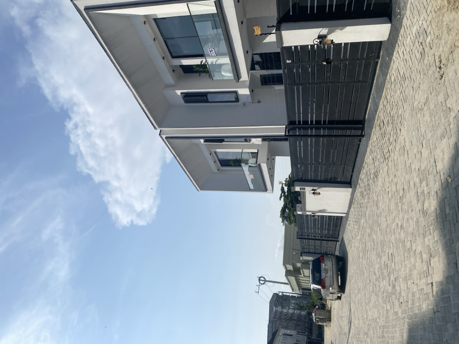 This image depicts a residential street scene in Alaguntan, Nigeria, under a clear blue sky with scattered white clouds. The primary subjects are two identical, modern, two-story detached residences constructed with white facades and dark-framed windows. Each residence features a first-floor balcony with a glass railing, containing a white planter and displaying a "SOLD" sign. The properties are enclosed by a dark grey horizontally slatted metal fence, supported by white concrete pillars. Two amber-colored, antique-style wall lanterns are mounted on these fence pillars. An electric fence insulator and wire are visible on the top right pillar. The street itself is paved with light grey interlocking concrete pavers. A silver minivan, appearing to be a Toyota Sienna, is parked on the left side of the street, facing away from the viewer. In the background, further down the street to the left, additional residential buildings, some appearing to be under construction, are visible, along with piles of concrete blocks and a utility pole with overhead lines. No people are present.