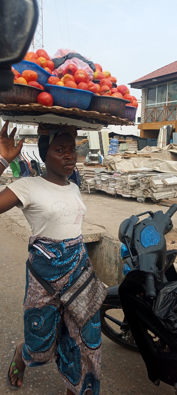 - "An adult female stands outdoors in Lokoja, Nigeria, actively carrying a large, multi-basket tray of tomatoes and other produce balanced on her head" by FM-f06ZA2, licensed under CC BY 4.0
