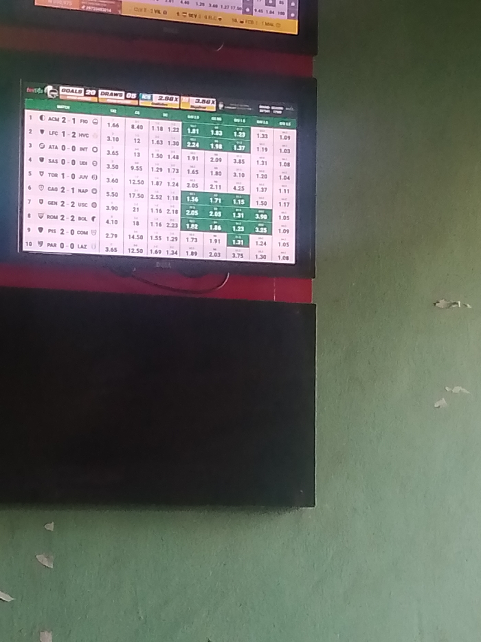 The image displays a screen showing betting odds for various soccer games. The list includes teams like ACM, FIO, LFC, HVC, ATA, INT, SAS, UDI, TOR, JUV, CAG, NAP, GEN, USC, ROM, BOL, PIS, COM, PAR, and LAZ. The display includes scores, the abbreviations "GOALS 2.0," "DRAWS O," "2.98X" and "3.56X." Several numerical columns represent different betting odds for various outcomes.