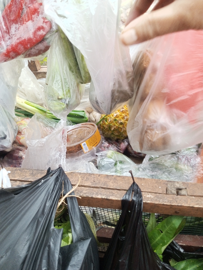 - "A wooden table is filled with a variety of groceries in plastic bags" by FM-KNwQf1, licensed under CC BY 4.0