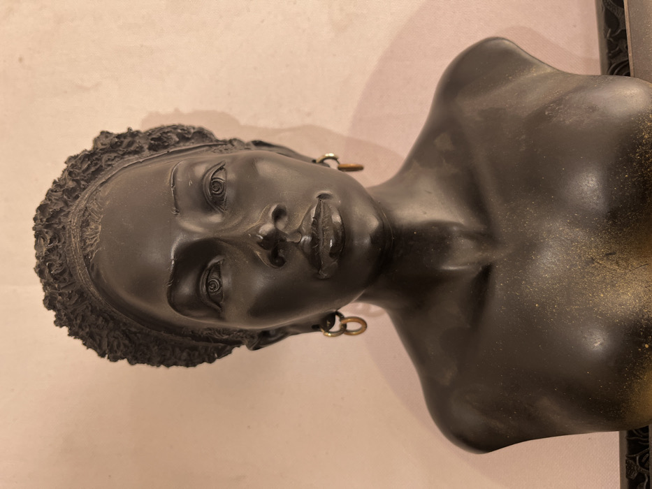 This image presents a dark-toned bust sculpture of an adult female, located in Jos, Nigeria
