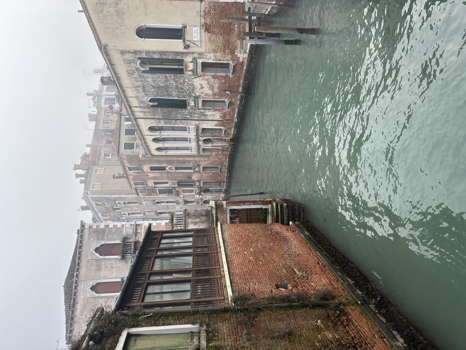 The image presents a view of a narrow canal in Venice, Italy, specifically identified by a street sign as Rio Tera dei Nomboli. The scene is dominated by a pervasive, heavy fog that obscures distant details and creates a diffused light, rendering the sky a uniform grey. The canal water, a murky teal color with minor surface ripples, occupies the central and lower portions of the frame. No boats or people are visible within the canal. Along its edges, several dark wooden mooring poles are present, particularly on the right bank. On the left bank, a multi-story, weathered brick building rises, featuring an enclosed wooden balcony or loggia with multiple windowpanes and dark, intricate railings at the first-floor level. Below this, closer to the foreground, a small, brick-lined entrance with stone steps descends directly into the water, fronted by a partially visible dark gate or door. The lower section of the brick wall shows signs of algae or plant growth. The right bank is lined with a series of multi-story buildings in various states of repair. The closest building exhibits severely deteriorated, peeling plaster over visible brickwork. It features a combination of rectangular and arched windows; some are open with dark shutters, while others are secured with metal grates. A white rectangular street sign, clearly legible as "RIO TERA DEI NOMBOLI," is affixed to this building. Further down the canal, buildings of differing architectural styles and colors (including pale pink, grey, and beige facades) recede into the fog. Numerous chimneys are visible on the rooftops.