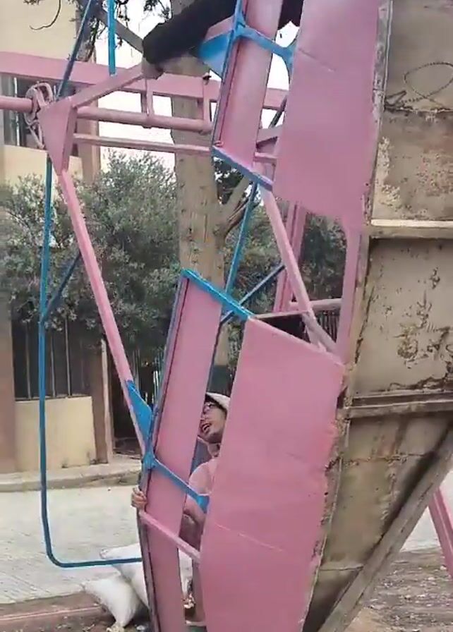 group of people on a swing set in an outdoor environment, likely a park or schoolyard. The swing set is a large, rotating structure made of pink and blue metal. Two people are inside the enclosed part of the swing, while another person is on top, holding onto the frame. The swing is rotating, causing the people inside to move around. The setting includes trees, a building, and a partially visible parked red moped or scooter. The weather appears overcast.