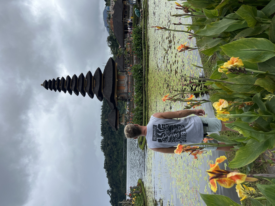 A man in a tank top and shorts stands by a lily pad-covered lake. Behind him is a multi-tiered Balinese temple with a black, pagoda-like structure and adjacent buildings. Lush green plants with orange and yellow flowers frame the right side. Distant hills and a cloudy sky complete the scene. The image is slightly tilted clockwise.