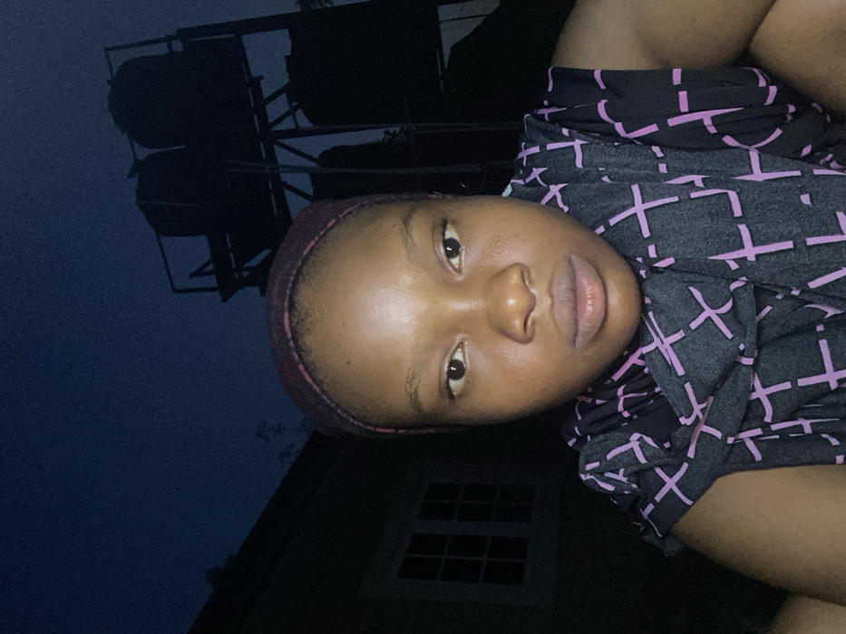 A person is photographed close up. They have dark hair and skin and are wearing a shirt with a pattern. In the background is a building with a window. A tall, dark structure of water tanks on a frame is behind the person and building. The sky is dark. The image is dimly lit and rotated to the left.