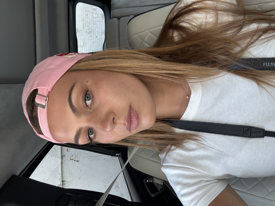 An individual is depicted inside a vehicle, occupying what appears to be the front passenger seat. The subject is a female with light brown hair, green eyes, and fair skin, looking directly into the camera with a neutral expression. She wears a light pink baseball cap reversed, a white short-sleeved t-shirt, and a thin necklace with a small, clear gemstone. A black camera strap, partially revealing "FUJI" branding, is visible across her chest. The vehicle's interior features cream-colored, diamond-quilted leather seats and black trim. A seatbelt is fastened across the subject's torso. Through the vehicle's windows, a light-colored exterior wall with a textured, possibly peeling surface is visible, suggesting the vehicle is stationary or moving slowly alongside a building or structure. This scene is located in Mexico City, Mexico.