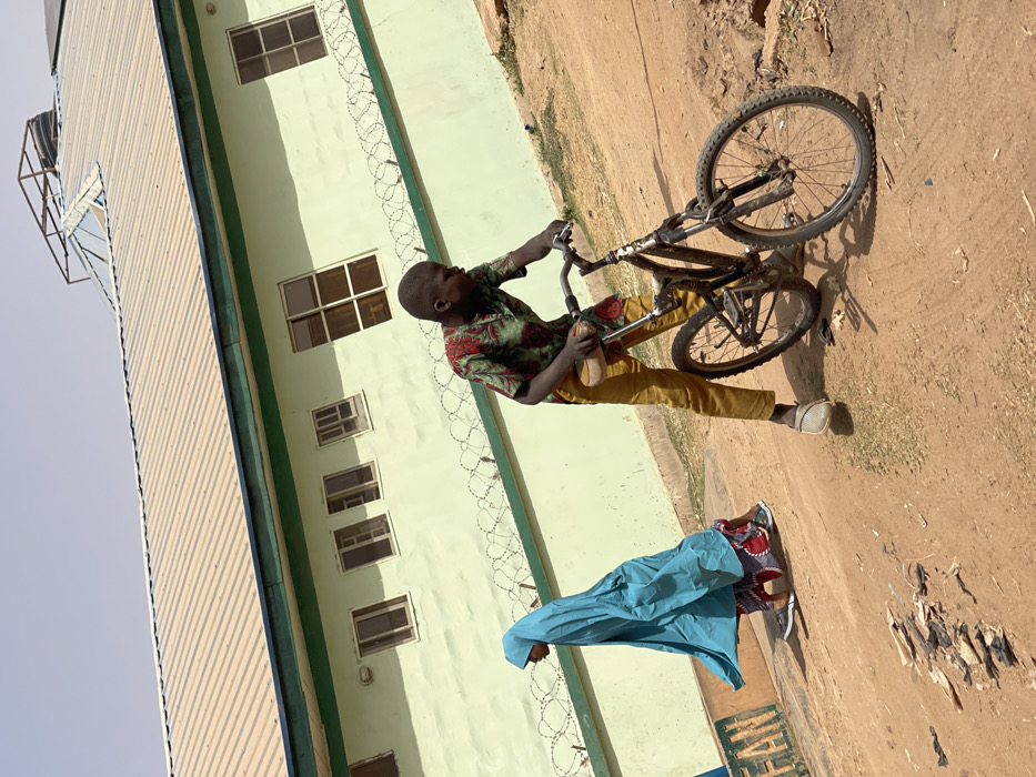 This image captures a daylight scene on a dirt path in Muchiya, Nigeria, featuring two individuals and a building
