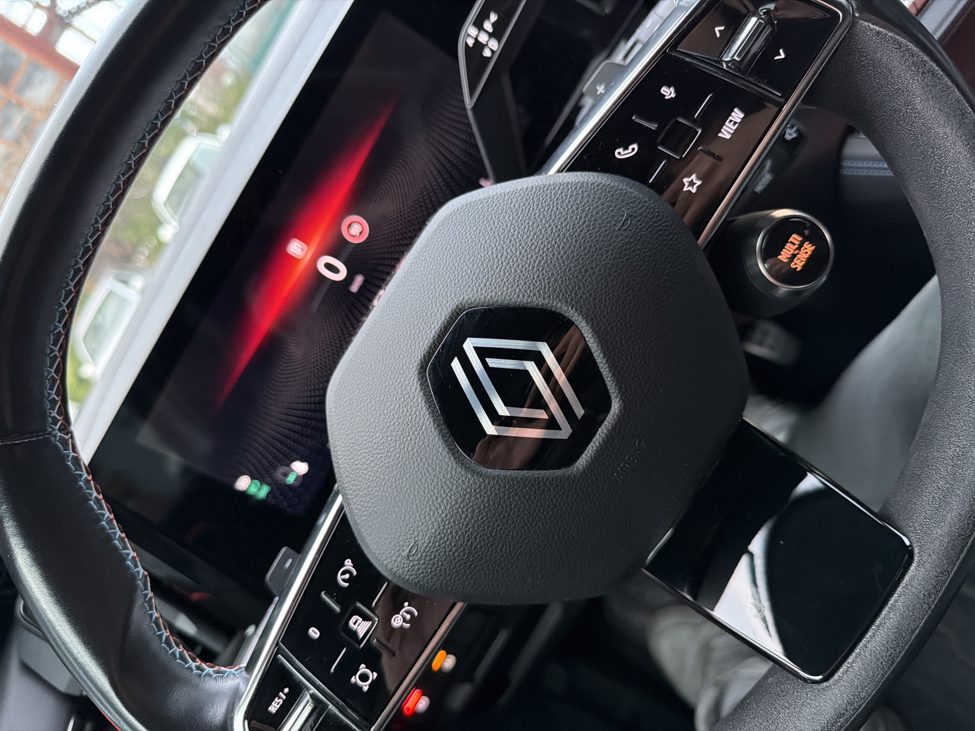 interior of a car, specifically the steering wheel and dashboard area. The steering wheel is black with a silver Renault logo in the center. Buttons and controls are visible on the steering wheel spokes. The dashboard features a digital display. The environment suggests a modern car interior. There is no indication of the location being Sofia, Bulgaria or any people or actions visible.