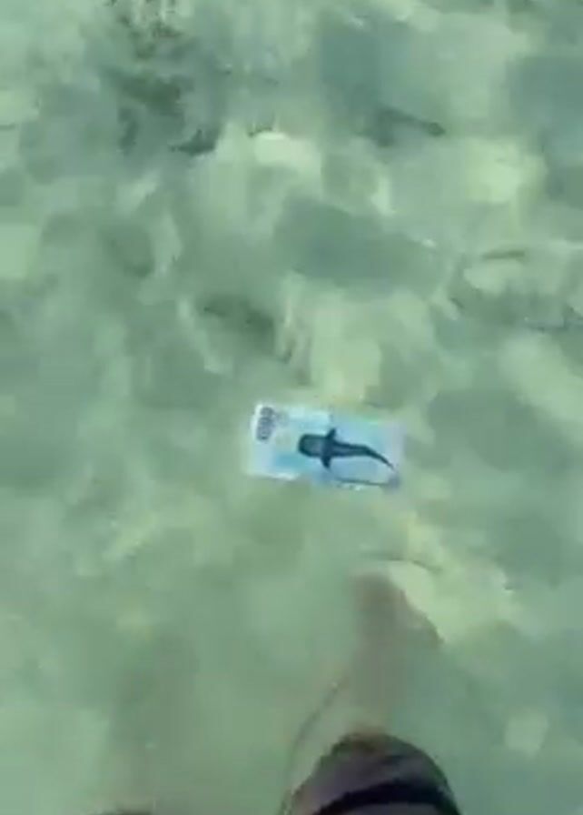 first-person view of someone standing in shallow, clear water. Visible below the water's surface is a banknote. The bill appears to feature an image of a shark. The bottom of the frame captures the legs of the person standing in the water, wearing dark-colored pants. The water has a sandy bottom.