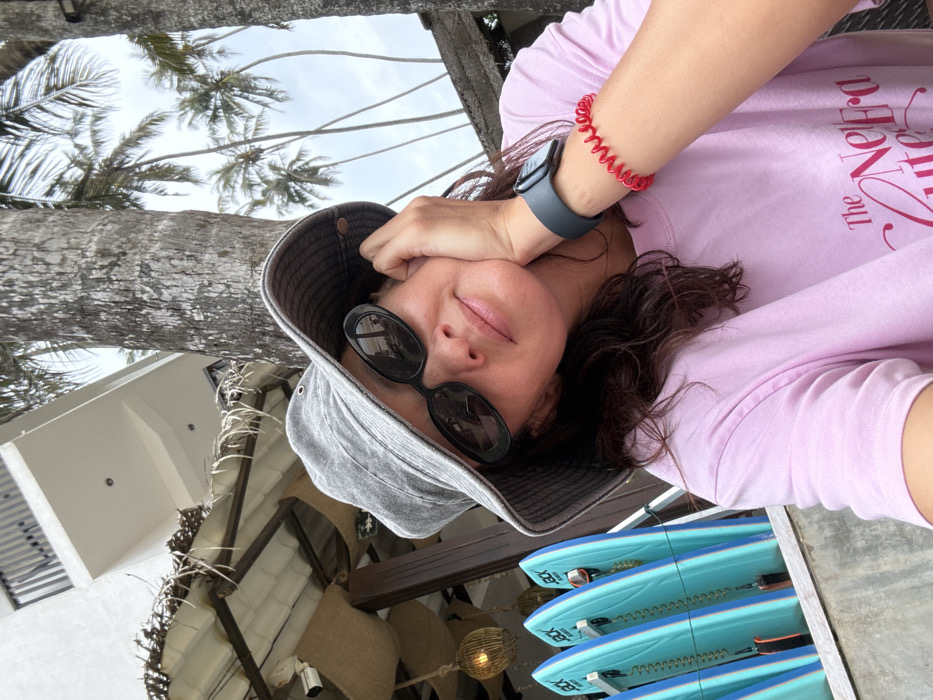 A woman in a bucket hat and sunglasses is tilted to the side, obscuring part of her face with her hand. She wears a pink long-sleeved shirt and a wristwatch. A red spiral bracelet adorns her other wrist. Palm trees are visible in the background, along with a building and several blue surfboards lined up. A woven light fixture and burlap cushions are also present. The scene suggests a beach or tropical location.