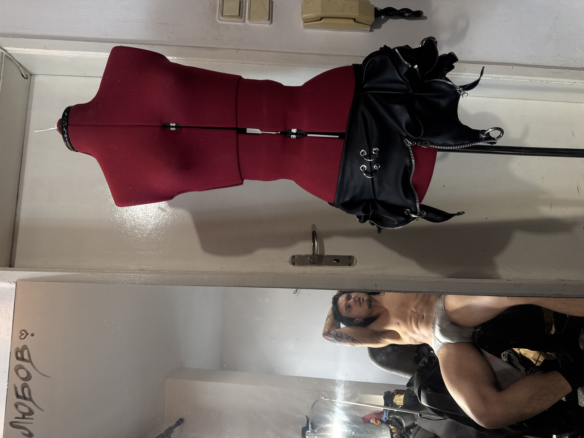red dress form with a black leather skirt attached to it. It is positioned in front of a mirror with "ЛЮБОВЬ" and a heart drawn on the left side, which translates to "LOVE" in Russian. The mirror reflects a man lying down wearing underwear. The room appears to be indoors, possibly a workshop or studio. Given the Russian graffiti and the context of a fashion studio, this might be located in a metropolitan area known for its blend of cultures, though a precise location in Sofia, Bulgaria, cannot be determined with certainty from the image alone.