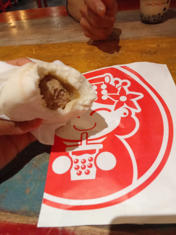 A partially eaten bao bun filled with a brown, meat-like substance is held in a hand. The bao is positioned in front of a white paper with a large red design. The design appears to be a cartoon face and a bubble tea graphic. In the background, a wood-colored table is visible, along with a person's hand and a beverage, possibly bubble tea.