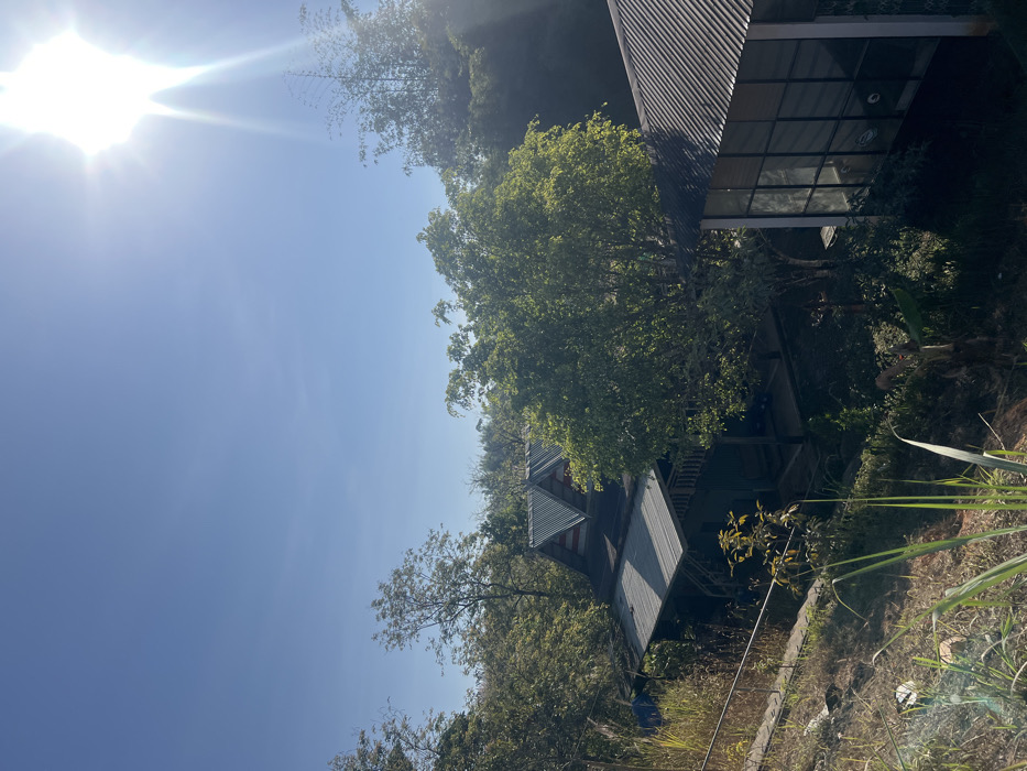 Two buildings are visible among trees under a sunny sky. One building has corrugated metal walls and a large window. The other, further away, has a gable roof and a wooden structure. Lush vegetation surrounds the buildings. The photo appears to have been taken from a low angle, possibly on a hillside.