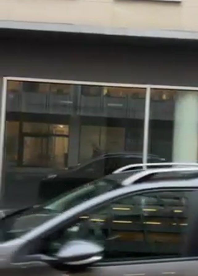 view from inside a car as it drives by buildings. The video passes by a red service van with a painter logo.