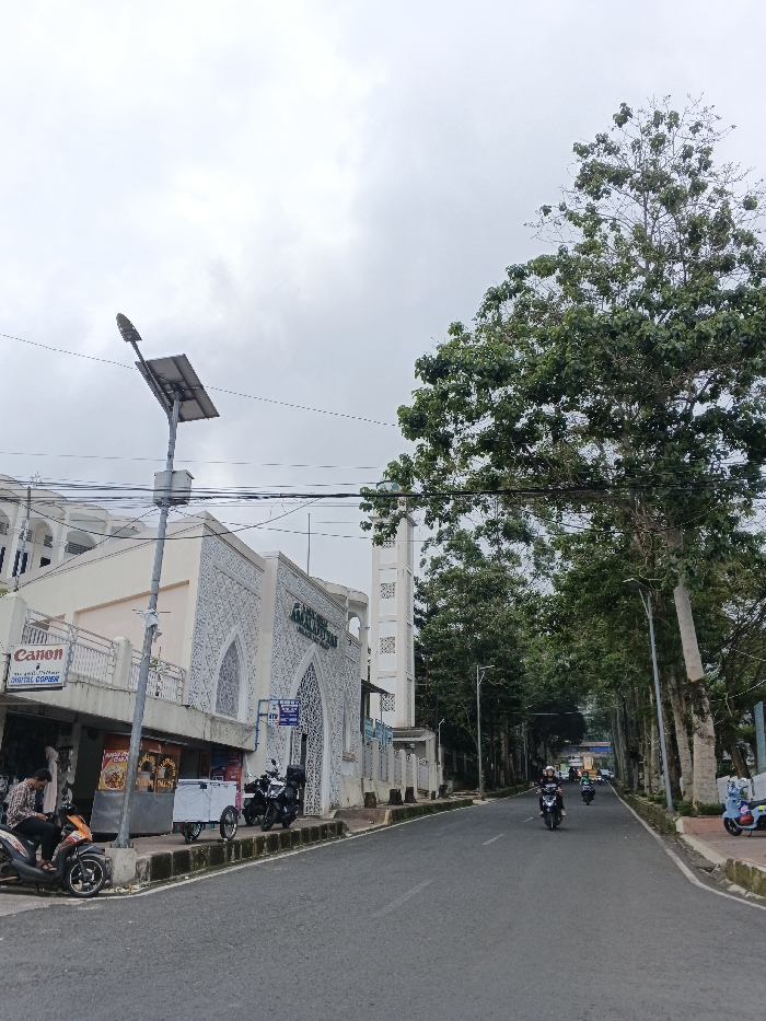 The scene is located in the city of Шчыткавіцкі сельскі Савет, Belarus. The image depicts a daylight urban street view under an overcast sky, looking uphill. On the left side, a multi-story building complex is visible. The lower level features a commercial storefront with a partially visible red "Canon" sign displaying white text and an additional sign in an unknown script. An individual in a plaid shirt is seated on an orange and black scooter/motorcycle parked on the sidewalk in front of this building. Another person is partially obscured behind them. A white, three-wheeled vendor cart is parked further along the sidewalk, followed by two dark motorcycles. Adjacent to these commercial structures is a mosque, characterized by intricate white and beige patterned walls with arched designs and a prominent green sign with white text over its main entrance. A tall, slender minaret with geometric cutouts stands to the right of the mosque's main structure. A grey lamppost equipped with a solar panel is situated in the left foreground, with numerous overhead utility lines crossing horizontally. The asphalt road, which slopes gradually upwards, occupies the central portion of the image. Multiple motorcycles are observed on the road; one dark motorcycle with a rider wearing a white helmet is in the mid-ground, heading away from the viewer, with another motorcycle following further behind. A light blue scooter/motorcycle is parked on the distant right sidewalk. The right side of the street features a distinct line of tall, mature trees with light-colored trunks and dense green foliage, forming a tree-lined avenue. A paved sidewalk and a dark green curb separate the trees from the roadway. Additional streetlights are visible further down the road among the trees.