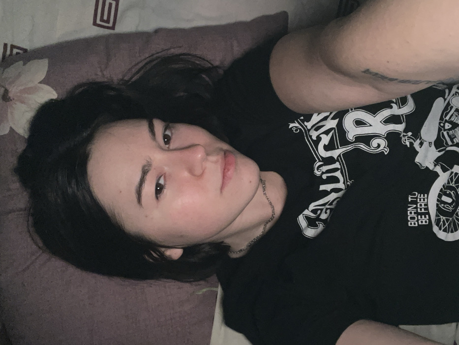 A young woman with dark hair and light skin is lying on a pillow with a floral print. She is wearing a black t-shirt with a white graphic design and the words "BORN TO BE FREE." A silver chain necklace is visible around her neck. Her arm is raised, revealing a faint tattoo. She is gazing at the camera with a slight smirk. The lighting is dim, casting shadows across her face and the surrounding area.