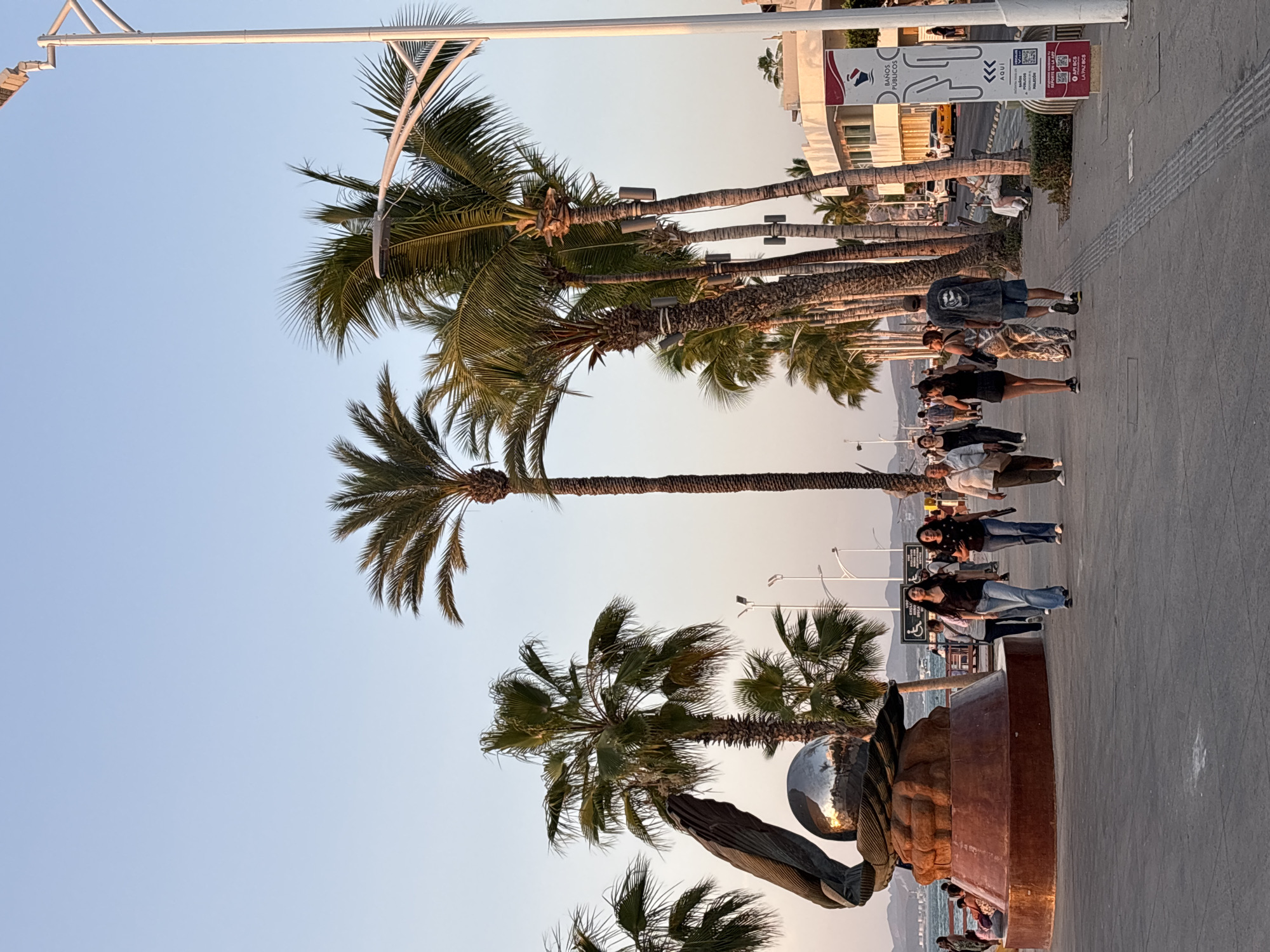 Here's a detailed description of the image: The image shows a scene along the Malecón in La Paz, Mexico. The boardwalk is lined with tall palm trees and a modern sculpture featuring a reflective silver sphere held by a sculpted hand. Several people are walking along the Malecón. A building with signs is visible behind the line of trees. The sky is pale blue. The light suggests it is late afternoon or early evening.