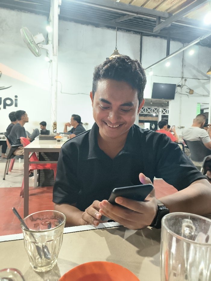 The image depicts an indoor scene within a casual eating establishment, likely a cafe or coffee shop, located in Lhokseumawe, Indonesia. The central subject is a young adult male with dark, curly hair and a light complexion, wearing a black polo shirt. He is seated at a light-colored table, holding a black smartphone horizontally with both hands, looking down at the screen, and displaying a wide smile with visible teeth. A black digital watch is present on his left wrist. In the immediate foreground, on the table, two clear drinking glasses are partially visible, one containing a silver spoon, along with a segment of an orange plate. The background shows other male patrons seated at various tables, some engaging in conversation or looking at phones. The establishment features white walls, one of which displays a partial "Kopi" logo and a white wall-mounted oscillating fan. A black flat-screen television is mounted on a wall in the mid-background. The ceiling consists of exposed metal beams with several hanging light fixtures and a decorative brass-toned lamp. Tables are primarily white-topped with red or black metal frames, accompanied by chairs with black seats and red or black frames. The flooring appears to be a reddish-brown tile. The area is brightly illuminated by artificial overhead lighting.