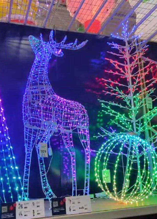display of illuminated Christmas decorations inside what appears to be a store. The decorations include a cone-shaped Christmas tree, a reindeer, a bare tree, and a sphere, all made of wireframes covered with colorful LED lights. Each item has a price tag attached. Behind the decorations is a backdrop depicting additional Christmas-themed figures, also illuminated. Above the display is a complex network of metal supports, typical of store shelving. A sign labeled "Inflatables" is visible on the right side of the frame. The camera angle is static, providing a clear view of the entire arrangement of decorations.