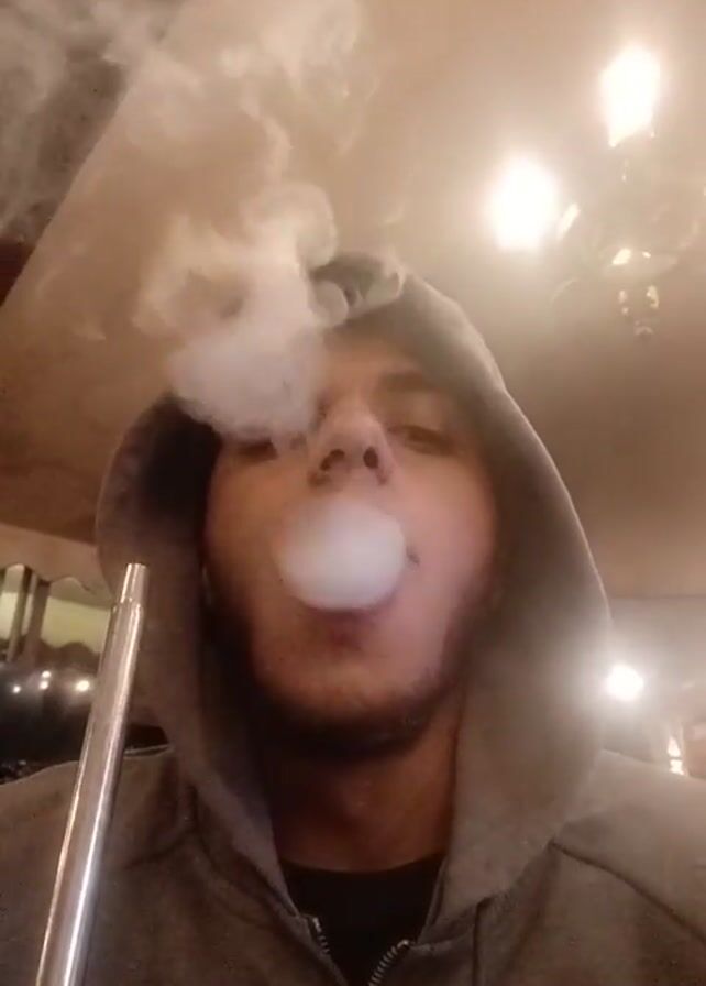 - "A young man wearing a gray hooded sweatshirt exhales a large cloud of smoke from his mouth while holding a metal hookah mouthpiece" by FM-hmmxi2, licensed under CC BY 4.0