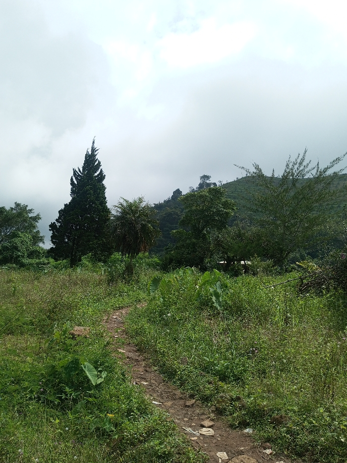 This image captures a verdant, rural landscape within the city of Nuwara Eliya, Sri Lanka, under an overcast sky. A narrow, winding dirt path, partially covered with small rocks and debris, dominates the foreground, extending from the bottom-center towards the midground. Dense, unkempt green vegetation, including tall grasses and broad-leafed plants resembling taro, flanks both sides of the path. In the midground, a tall, slender, dark green coniferous tree stands prominently on the left, flanked by a smaller palm tree to its right. Further right, another bushy tree with lighter green, spiky foliage is visible. The background reveals a steep, mountainous hillside, largely covered in lush greenery. The upper right section of the hillside displays organized rows of plants, indicative of agricultural cultivation, likely a tea plantation. No individuals or animals are present in the scene.