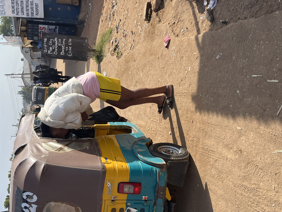 A man is bending over and peering inside a colorful, three-wheeled vehicle on a sunny day. He wears a white jacket, pink shirt, and yellow shorts with black stripes. Behind him, a sign displays a sports match schedule: "Man City vs. Bournemouth 5:30, Barcelona vs. Elche 6:30." The sign also advertises services like online registration, photocopying, lamination, NIN retrieval, SIM card registration, and passport assistance. The scene takes place on a dirt road with scattered debris.