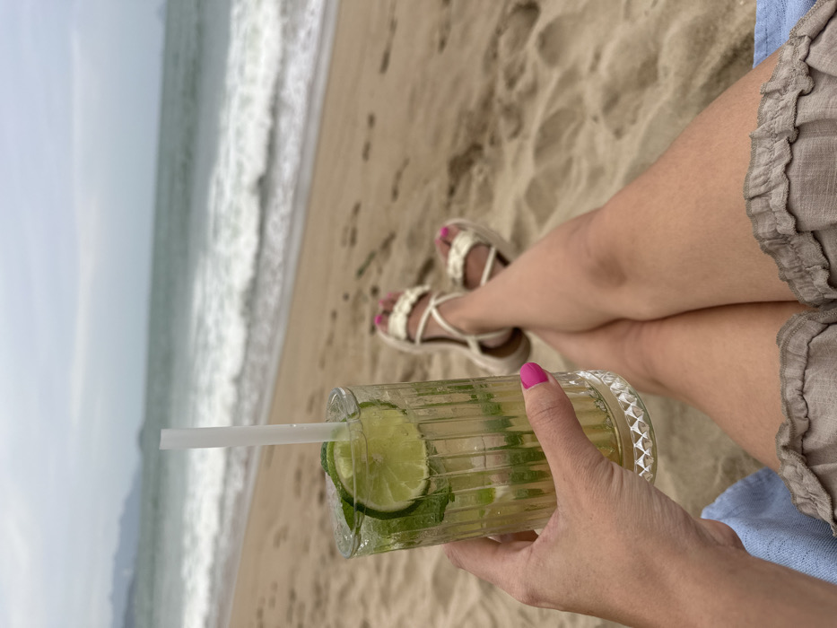 A first-person view shows a person seated on a sandy beach in Nha Trang, Vietnam. The foreground is dominated by a left hand, displaying bright pink manicured fingernails, holding a clear, vertically ribbed glass. The glass contains a cocktail-like beverage with clear liquid, ice cubes, two prominent lime slices, and several mint leaves, penetrated by a white plastic straw. Below the hand, two bare legs are crossed at the knees, clad in light-colored shorts with a ruffled hem, positioned over a blue garment. The feet are adorned with cream-colored strappy sandals, and the toenails are painted bright pink. The midground consists of tan sand with scattered footprints. The background features a gray-green ocean with breaking white waves under an overcast sky, with faint landmasses visible on the distant horizon to the left.
