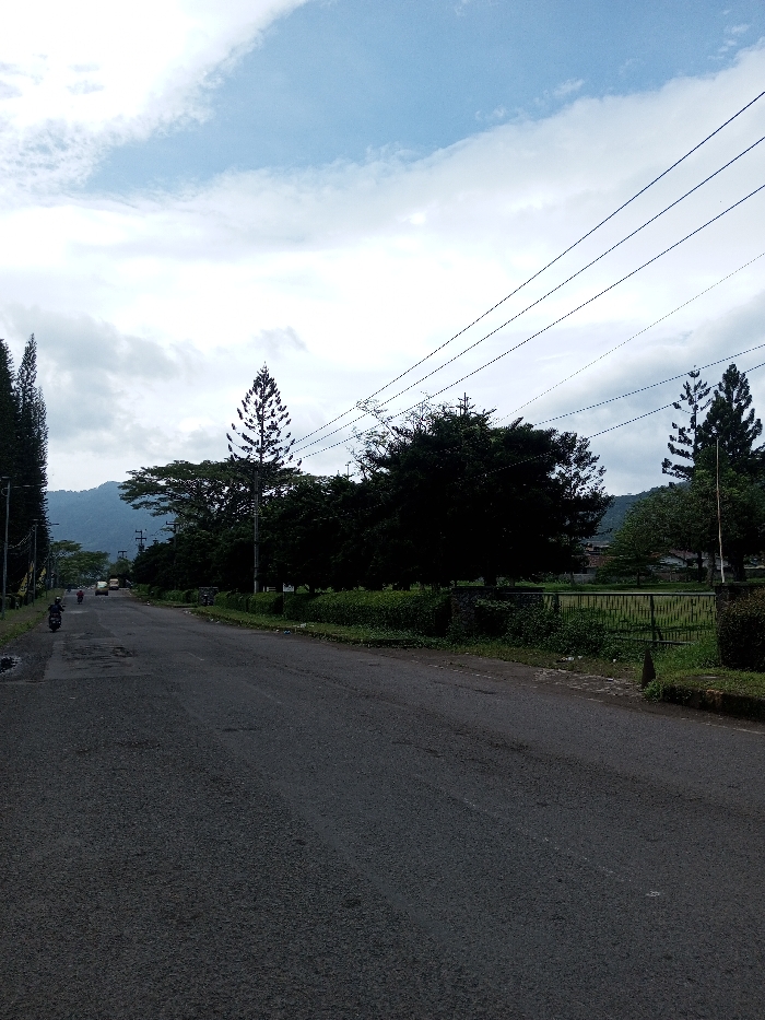 The image depicts a roadside scene in Ariyalai, Sri Lanka, captured under a partially cloudy sky. An asphalt road, exhibiting cracks and patches, extends from the foreground towards the distant background. On the left side of the road, a dirt shoulder transitions into a grassy verge lined with tall, slender evergreen trees and utility poles with streetlights. A single individual on a black scooter is visible on the left side of the road, traveling away from the viewer. Further in the distance on the same side, a yellow vehicle, possibly a small bus, is present. The right side of the road features a grassy verge, followed by a dense line of various trees and shrubs. A dark green metal gate is partially visible behind this vegetation, accessing an open area. Multiple power lines traverse diagonally across the upper portion of the frame. In the far background, mountains or hills are visible beneath the cloudy horizon. The overall lighting suggests daytime conditions.